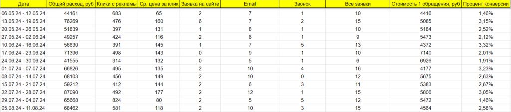 Кроме того, клиент позволил считать как заявки 50% от всех кликов по номеру телефона, так как обращения оставляют и с помощью звонков. В результате удалось уменьшить стоимость заявки до 9500 рублей.