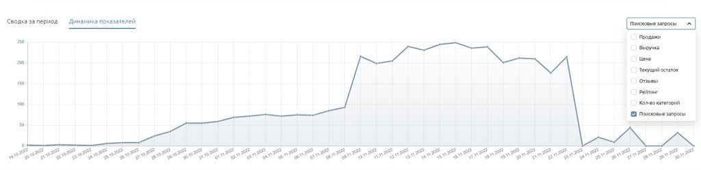 Все это позволило подняться на следующий уровень. Количество поисковых запросов выросло до максимума в середине ноября — свою роль сыграла реклама на Wildberries, которая закрепила позиции нашего товара по выбранным ключам.
