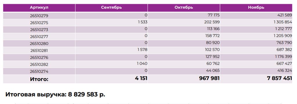 После запуска рекламы нам удалось повысить продажи в октябре более, чем в 230 раз по сравнению с сентябрьскими показателями. Но октябрьский доход в 1 000 590 рублей в несколько раз был перекрыт ноябрьской выручкой в 8 000 243 рублей. Не только за счет оптимизации и рекламы, но и за счет повышения цен на товар при увеличении продаж.